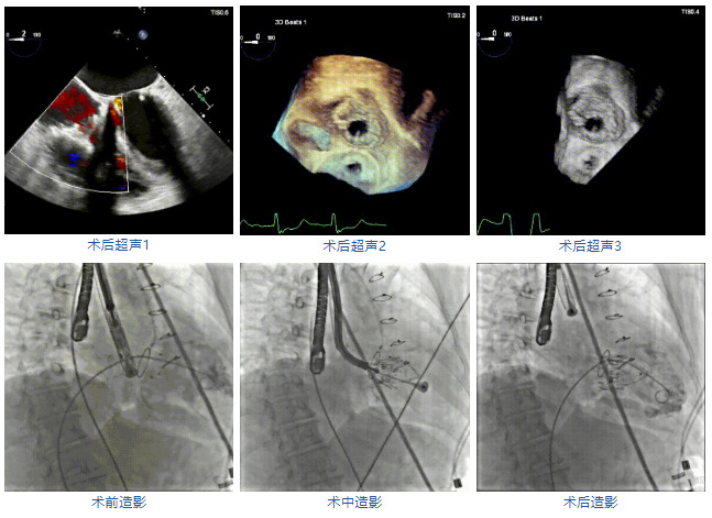 手術(shù)在患者全麻狀態(tài)下進(jìn)行,采用經(jīng)右側(cè)頸靜脈作為入路,將裝載有人工瓣膜的輸送器緩慢推送至右心房;并在經(jīng)食道超聲和DSA的引導(dǎo)下小心調(diào)整輸送器角度,將輸送器送入右心室;逐步釋放瓣膜錨定裝置和盤片,調(diào)整瓣膜位置后,錨定瓣膜完成植入。術(shù)后右房壓明顯下降,從術(shù)前的25/10(16) mmHg降至術(shù)后即刻的12/7(10) mmHg,術(shù)后超聲提示人工三尖瓣同軸性良好,固定牢固,無反流及瓣周漏,手術(shù)室即刻拔除氣管插管。
