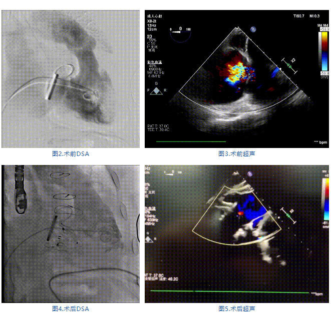 手術(shù)在全麻狀態(tài)下進(jìn)行,郭惠明教授團(tuán)隊采用經(jīng)右側(cè)頸靜脈入路的方式送入輸送器進(jìn)入體內(nèi),并在TEE和DSA的指引下進(jìn)行。在輸送器進(jìn)入右室后釋放室間隔錨定裝置,旋轉(zhuǎn)輸送器,使得錨定裝置對準(zhǔn)室間隔面;而后釋放前瓣夾持件,確定夾持件位于右室側(cè)釋放LuX-Valve Plus人工瓣膜盤片,再使用DSA和超聲確認(rèn)盤片是否位于右房側(cè),同時調(diào)整瓣膜的同軸性。緊接著在DSA和超聲的監(jiān)視下調(diào)整室間隔錨定件貼合室間隔,釋放室間隔錨定裝置。再次確認(rèn)瓣膜的穩(wěn)定性和同軸性后,將輸送器撤出體內(nèi),最終完成LuX-Valve Plus人工瓣膜植入(圖2-5),手術(shù)獲得圓滿成功。患者在手術(shù)室即刻拔除氣管插管,術(shù)后超聲提示LuX-Valve Plus人工三尖瓣瓣膜同軸性良好,瓣架固定牢靠,無反流和瓣周漏。