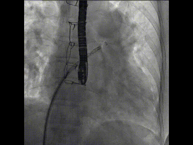 術(shù)中首先在局麻下穿刺股動脈、股靜脈,完成心導(dǎo)管檢查評估后轉(zhuǎn)為全麻,在食道超聲引導(dǎo)下穿刺房間隔,穿刺成功后將加硬導(dǎo)絲送入左上肺靜脈建立軌道,根據(jù)患者病情行球囊預(yù)擴(kuò)張后植入6mm孔徑房間隔造孔支架,經(jīng)透視及食道超聲評估支架左右盤展開良好,夾持于房間隔兩側(cè),固定穩(wěn)定、位置良好,食道彩超顯示房水平右向左為主分流,分流孔直徑符合預(yù)期大小,心導(dǎo)管檢查評估達(dá)到預(yù)期效果,釋放造孔支架。術(shù)后12h患者下床活動,恢復(fù)順利,擬于近日完善術(shù)后評估后出院。