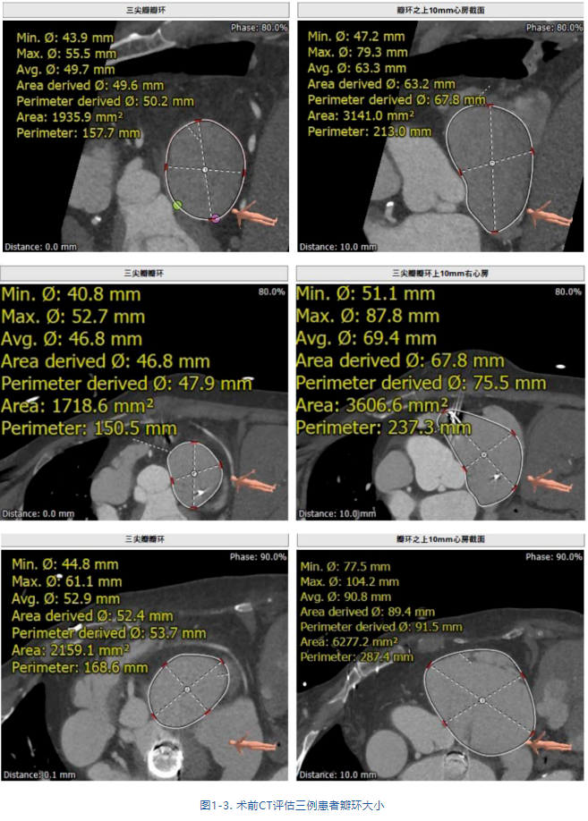 接受治療的是三例重度三尖瓣反流患者,術(shù)前基礎(chǔ)疾病多,均患有嚴(yán)重心律失常,其中兩例患者NYHA心功能Ⅱ/Ⅲ級。結(jié)合術(shù)前CT評估結(jié)果,三例患者的自體瓣環(huán)都較大(圖1-3),最大者平均瓣環(huán)為53.7mm;有一例患者有起搏器植入史,術(shù)中操作有纏繞起搏器導(dǎo)線的風(fēng)險;三例患者入路血管均無嚴(yán)重迂曲和鈣化。經(jīng)術(shù)前討論分析,潘湘斌教授及其團(tuán)隊潘家華教授、朱達(dá)教授、王首正教授以及心超室的駱志玲教授,董念國教授及其團(tuán)隊謝明星教授、尚小珂教授、陳澍教授、鐘禹成教授經(jīng)過討論決定,采用創(chuàng)新的 LuX-Valve Plus經(jīng)血管三尖瓣置換系統(tǒng)對患者進(jìn)行手術(shù)。LuX-Valve Plus是我國自主研發(fā)的經(jīng)血管介入三尖瓣置換系統(tǒng),經(jīng)頸靜脈入路的微創(chuàng)方式可進(jìn)一步降低對患者的創(chuàng)傷。