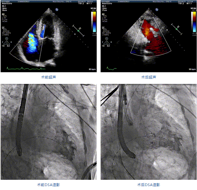 團隊前期經(jīng)過多次討論,制定了周密的手術(shù)策略和預(yù)案。由于患者已是近九旬的超高齡老人,傳統(tǒng)外科開胸手術(shù)風(fēng)險極高,純介入經(jīng)血管三尖瓣替換能夠明顯減少創(chuàng)傷。術(shù)中陳茂及馮沅教授結(jié)合體表定位在造影指示下精準穿刺右側(cè)頸靜脈并預(yù)置兩把血管縫合器。成功建立經(jīng)皮血管入路后在食道超聲和DSA的引導(dǎo)下順利完成人工瓣膜植入,術(shù)后超聲和造影顯示人工三尖瓣同軸性良好,瓣架固定牢靠,無反流和瓣周漏,平均跨瓣壓差降為1mmHg。術(shù)畢收緊預(yù)置的血管縫合器縫線完成止血,縫合效果滿意,在手術(shù)室即刻拔除氣管插管。