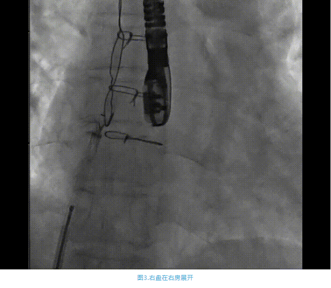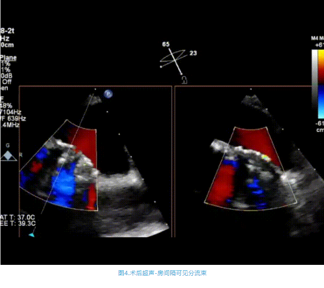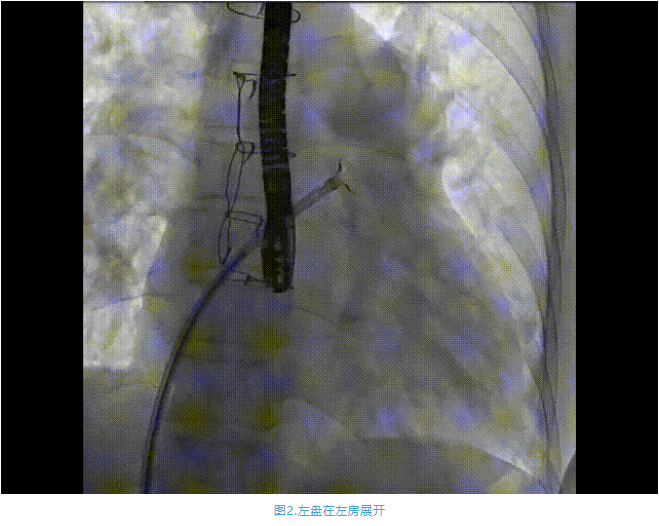 術(shù)中首先在局麻下穿刺股動脈、股靜脈,完成心導管檢查評估后轉(zhuǎn)為全麻,在食道超聲引導下穿刺房間隔,穿刺成功后將加硬導絲送入左上肺靜脈建立軌道,根據(jù)患者病情行球囊預擴張后植入6mm孔徑房間隔造孔支架,經(jīng)透視及食道超聲評估支架左右盤展開良好,夾持于房間隔兩側(cè),固定穩(wěn)定、位置良好,食道彩超顯示房水平右向左為主分流,分流孔直徑符合預期大小,心導管檢查評估達到預期效果,釋放造孔支架。術(shù)后12h患者下床活動,恢復順利,擬于近日完善術(shù)后評估后出院。
