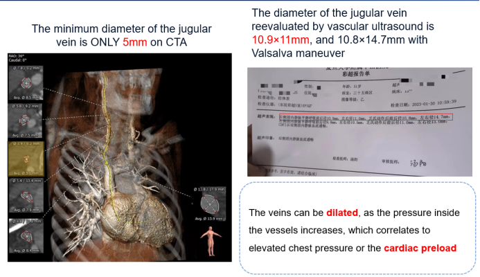 在早期篩選的病人中,有部分病人的頸內(nèi)靜脈最小直徑小于8.5mm,導(dǎo)致無法接受Lux-Valve Plus治療。然而在之后的臨床實(shí)踐中,術(shù)者們發(fā)現(xiàn)通過增加胸腔壓力或心臟前負(fù)荷,頸內(nèi)靜脈可以被擴(kuò)張。如下圖中的病例,術(shù)前的頸部CT顯示頸內(nèi)靜脈最小徑僅為5mm,然而乏式動(dòng)作(Valsalva maneuver)后血管內(nèi)超聲測(cè)得的內(nèi)徑為11mm。這樣的病例提示不能僅僅依靠術(shù)前的頸部CTA來作為唯一的血管入路排除標(biāo)準(zhǔn),通過一些術(shù)前準(zhǔn)備,頸內(nèi)靜脈的內(nèi)徑可以被擴(kuò)張,而血管內(nèi)超聲可以監(jiān)測(cè)這一變化。