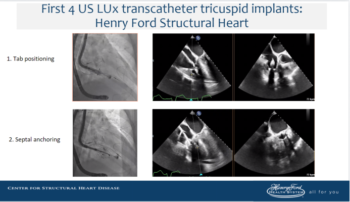Dee Dee Wang教授分享了Henry Ford Hospital前4例Lux-Valve Plus的植入經(jīng)驗(yàn),并提示術(shù)中確定瓣葉夾持鍵的位置處于三尖瓣瓣環(huán)下方(右心室側(cè)),以及室間隔固定片與室間隔的相對(duì)位置關(guān)系是最關(guān)鍵的兩個(gè)步驟。使用經(jīng)胃底短軸切面,有時(shí)配合右室流入/流出道切面的X-plane就能較容易地獲取相關(guān)影像。由于Lux-Valve Plus對(duì)超聲影像的要求較低,手術(shù)過程會(huì)相對(duì)比較流暢。