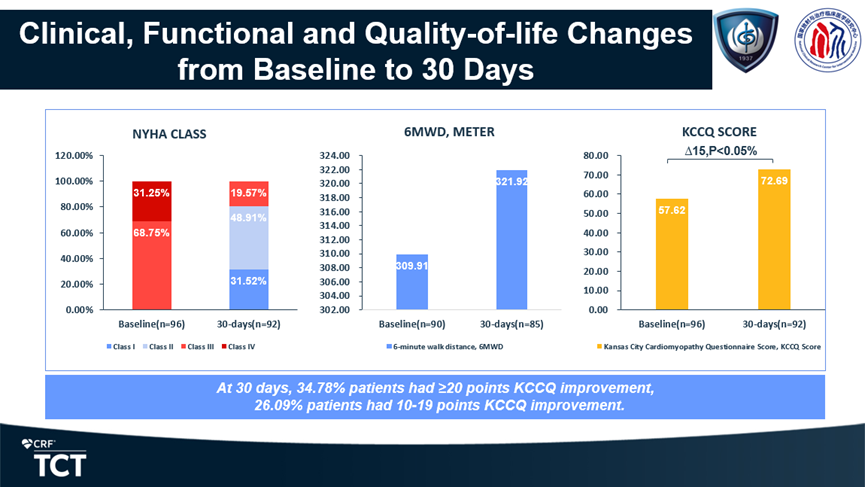 100%患者三尖瓣反流降低至輕度及以下,97.81%患者顯示無或僅微量瓣周漏 在美國紐約心臟協(xié)會(huì)(NYHA)心功能改善和生活質(zhì)量評(píng)分方面,80.43%患者由術(shù)前NYHA Ⅲ/Ⅳ級(jí)提升至Ⅰ/Ⅱ級(jí),34.78%患者KCCQ評(píng)分提升≥20分,26.09%患者提升10~19分