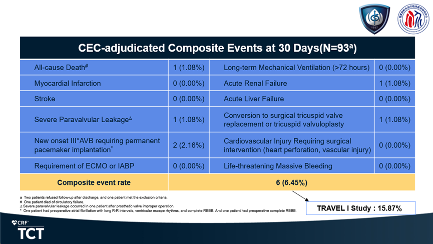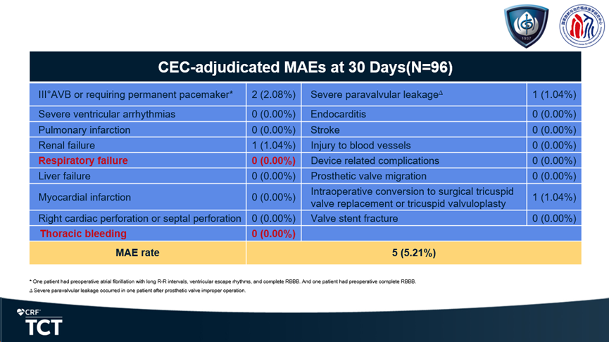 心肌梗死、卒中、使用ECMO或IABP、急性肝功能衰竭、長期機(jī)械通氣(>72小時(shí))、需要外科干預(yù)的心血管損傷(心臟穿孔、血管損傷)、危及生命的大出血事件發(fā)生率均為0全因死亡率僅為1.08%(與器械無關(guān)) 急性腎臟衰竭、重度瓣周漏和中轉(zhuǎn)外科三尖瓣置換或成形術(shù)發(fā)生率均僅為1.08%新發(fā)Ⅲ度房室傳導(dǎo)阻滯需植入永久心臟起搏器發(fā)生率僅為2.16%