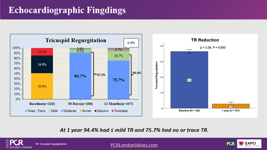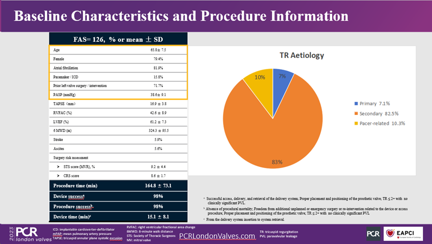 患者平均年齡65.8±7.5,79.4%為女性,81.9%患有房顫,15.8%有PM/ICD(起搏器/植入型心律轉(zhuǎn)復除顫器)植入史,71.7%有左心手術史,PASP(肺動脈收縮壓)38.6±9.1mmHg。所有患者均為重度三尖瓣反流,其中7.1%為原發(fā)性三尖瓣反流,82.5%為繼發(fā)性三尖瓣反流,10.3%為起搏導線引起的三尖瓣反流。