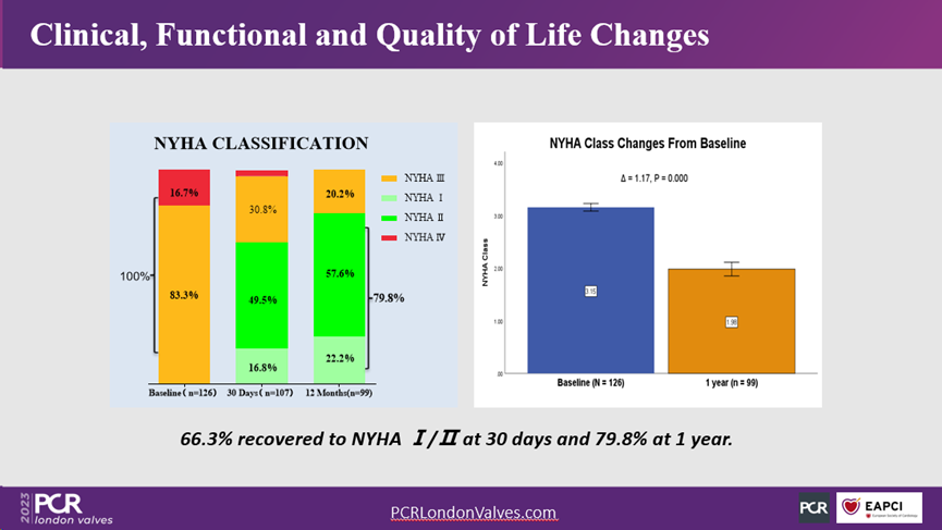 在隨訪30天時,66.3%的患者NYHA心功能由術前Ⅲ/Ⅳ級改善至Ⅰ/Ⅱ級;在隨訪一年時79.8%的患者由術前Ⅲ/Ⅳ級改善至Ⅰ/Ⅱ級,展現(xiàn)出了產(chǎn)品能夠持續(xù)改善患者的心功能。6MWD(6分鐘步行距離)在隨訪30天時,由基線324.3m提升至333.6m,在隨訪一年時即提高至383.2m,患者的生活質(zhì)量得到顯著改善。