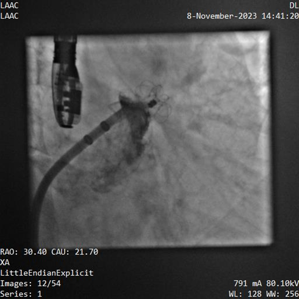 該例患者為男性58歲,陣發(fā)性房顫,9個(gè)月前突發(fā)急性腦梗死,3月前曾行房顫射頻消融術(shù)。2023年11月經(jīng)胸超聲心動(dòng)圖示左房內(nèi)徑46mm,經(jīng)食道超聲心動(dòng)圖示左心房及左心耳內(nèi)未見血栓形成,CHA2DS2-VASc評(píng)分3分,HAS-BLED評(píng)分2分。DSA測得左心耳開口直徑約23mm,錨定區(qū)域約18mm。