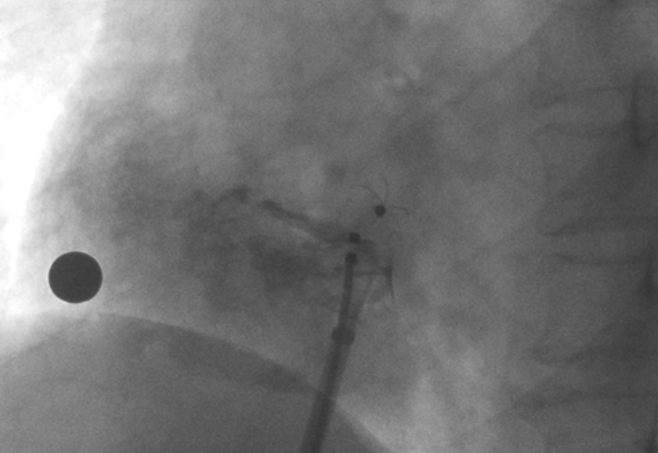 造影顯示PFO封堵完全,無殘余分流, 試驗(yàn)器械充分舒展并貼合良好