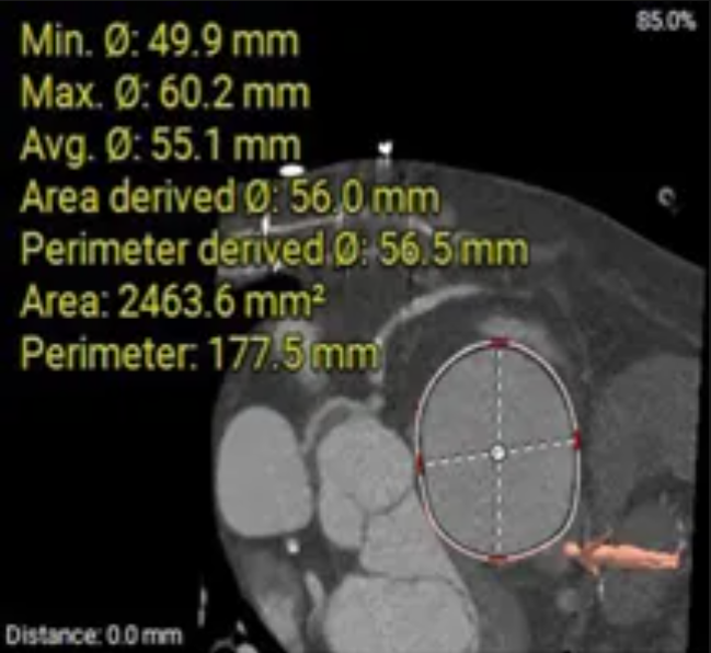 術(shù)前CT測量:三尖瓣瓣環(huán)最大徑60.2mm,周長平均徑56.5mm,瓣環(huán)顯著擴張。