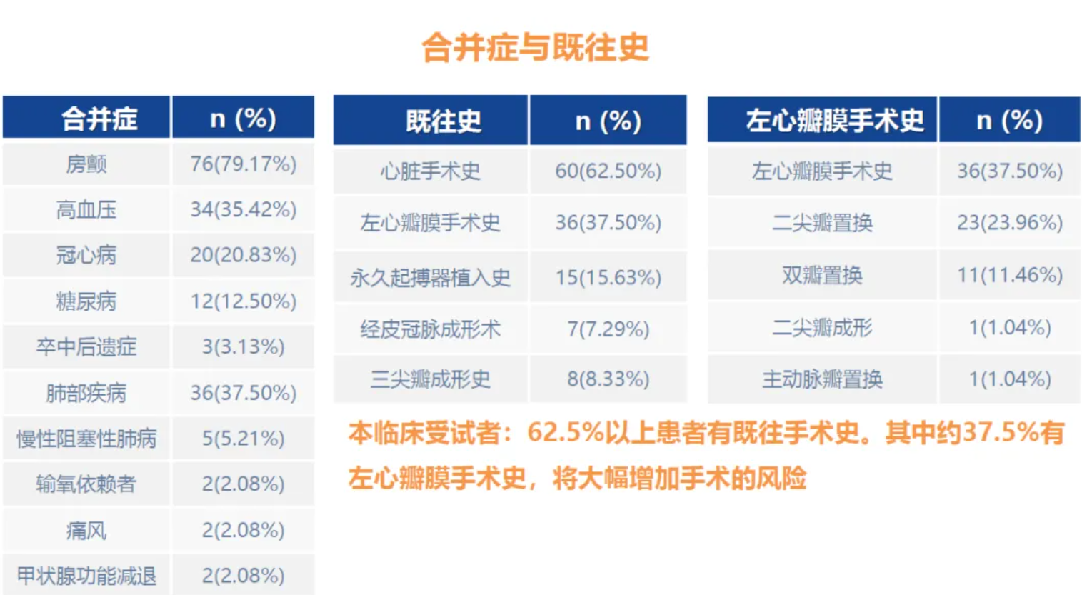 TRAVEL II 研究是一項(xiàng)前瞻性、多中心、單臂臨床試驗(yàn),主要用于評(píng)估LuX-Valve Plus于重度三尖瓣反流患者中應(yīng)用的長(zhǎng)期安全性和有效性。TRAVELL II 臨床試驗(yàn)共納入了中國(guó)15家臨床中心的96例患者。患者平均年齡為71.35歲,平均STS評(píng)分為9.09%,37.50%的患者在研究前接受了左心瓣膜手術(shù),15.63%的患者有過(guò)起搏器植入史,同時(shí)多合并其他基礎(chǔ)病,基線情況較差,存在較高的外科手術(shù)風(fēng)險(xiǎn)和接受其他方式介入治療的難度。