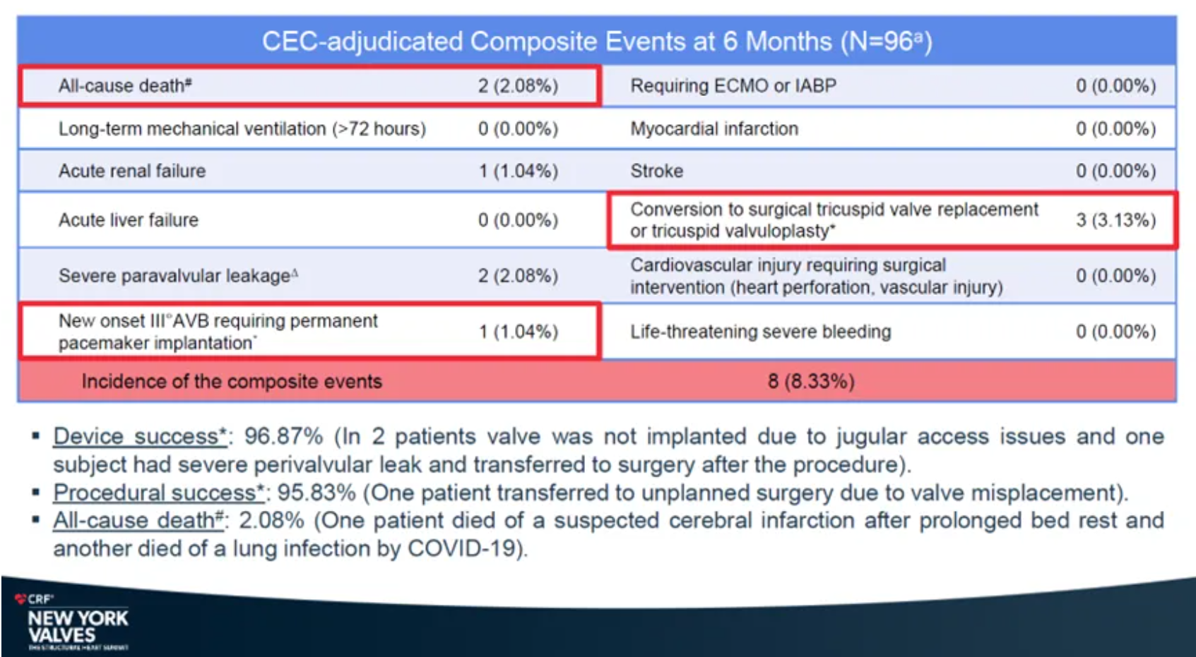 安全性結(jié)果顯示,復(fù)合事件發(fā)生率為8.33%。心梗、卒中、使用ECMO(體外膜肺氧合)或IABP(主動脈內(nèi)球囊反搏)、急性肝功能衰竭、長期機械通氣(>72小時)、需要外科干預(yù)的心血管損傷(心臟穿孔、血管損傷)、危及生命的大出血事件發(fā)生率均為0%。全因死亡率僅為2.08%,急性腎臟衰竭、重度瓣周漏和中轉(zhuǎn)外科三尖瓣置換或成形術(shù)發(fā)生率分別為1.04%、2.08%和3.13%。新發(fā)III度房室傳導(dǎo)阻滯需植入永久心臟起搏器的發(fā)生率僅1.04%。