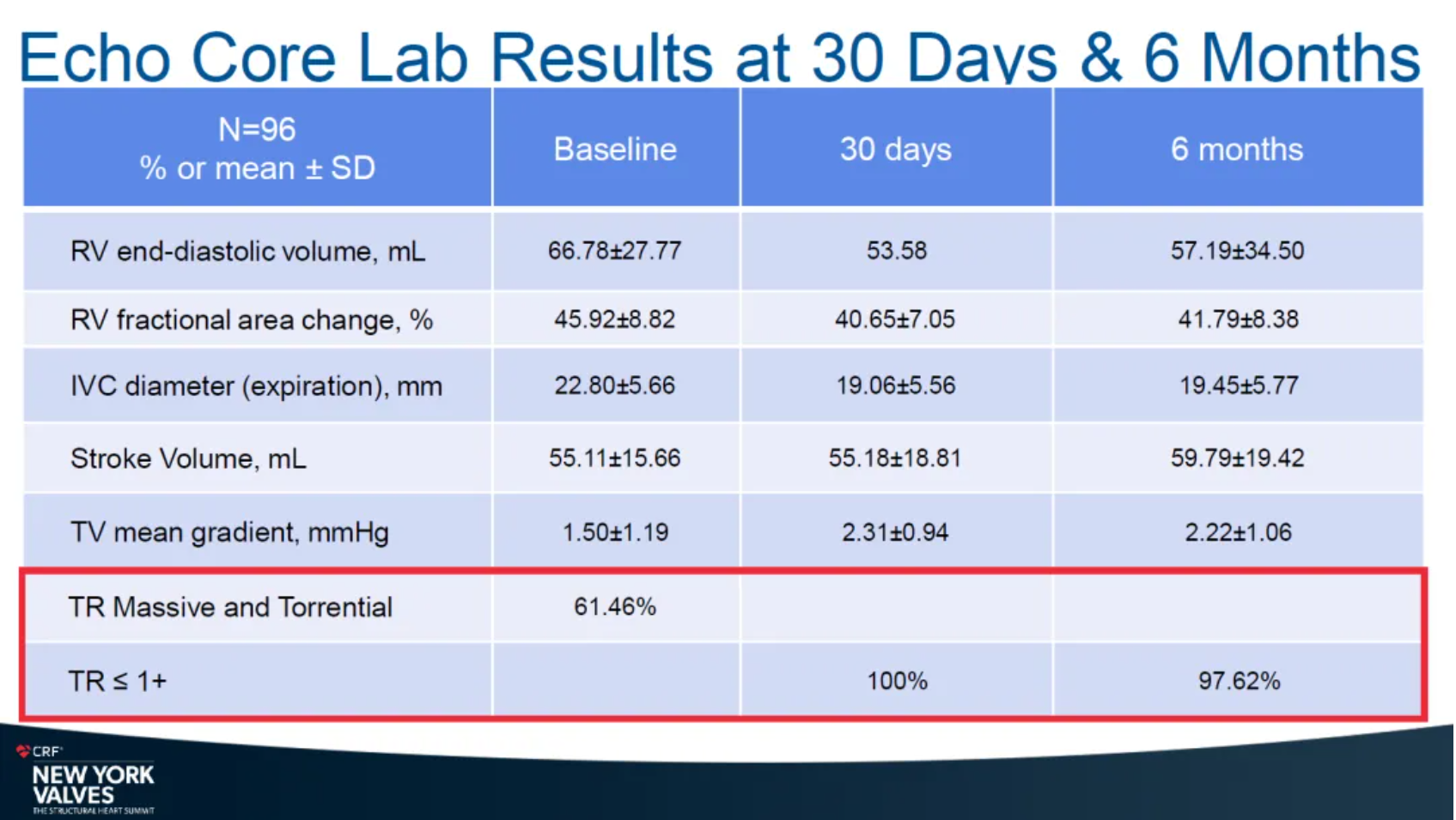 術(shù)后即刻和30天的數(shù)據(jù)依然展現(xiàn)了優(yōu)異的治療結(jié)果。首先,術(shù)后即刻患者的反流等級得到改善,94.7%的患者恢復(fù)到≤2+,新發(fā)起搏器的植入率僅為3.9%。隨后,30天的數(shù)據(jù)顯示,患者反流等級顯著降低,95%的患者恢復(fù)至≤2+,NYHA心功能等級持續(xù)提升,85.4%的患者提升至術(shù)后的I/II級。此外,超聲影像也顯示患者右心系統(tǒng)重塑獲益。