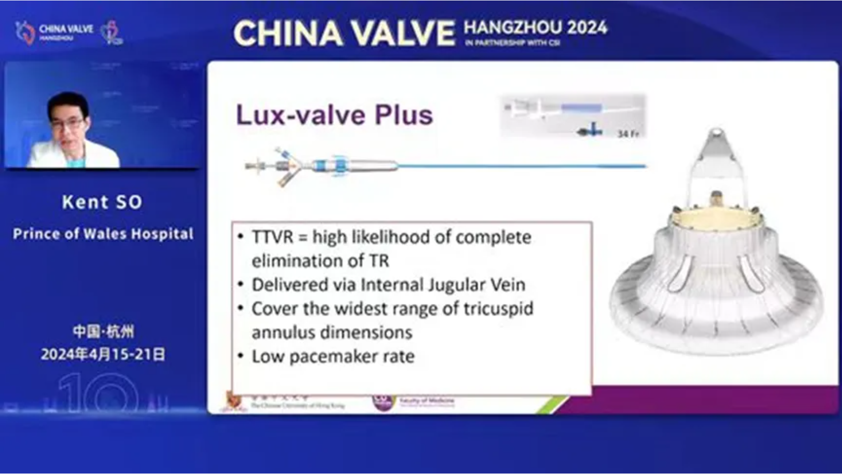 LuX-Valve Plus早期在香港的臨床數(shù)據(jù)和經(jīng)驗由來自中國香港威爾斯親王醫(yī)院(Prince of Wales Hospital, Hong Kong, China)的Kent SO(蘇澤宇)教授在2024杭州瓣膜會上進(jìn)行了分享,并且指出這是一款有潛力的TTVR器械,能覆蓋較廣范圍的三尖瓣瓣環(huán)尺寸并帶能降低起搏器的植入率,展現(xiàn)了良好的術(shù)中和短期治療效果。