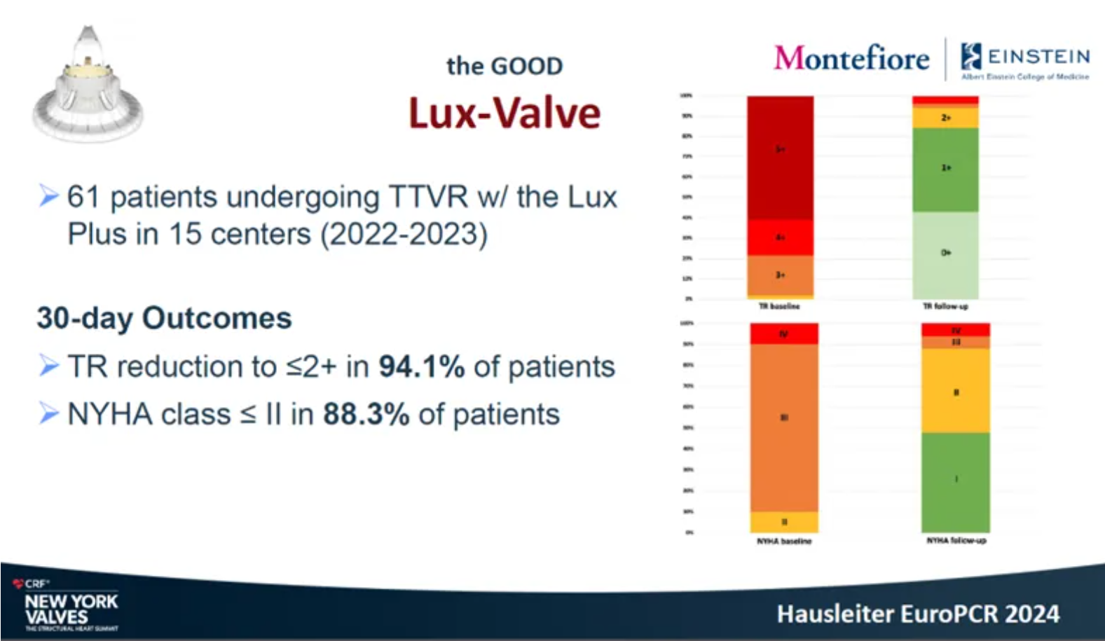 隨后在2024年紐約瓣膜會上,Hausleiter教授再次提及LuX-Valve Plus,并介紹到對于不適合做T-TEER術(shù)式的患者也是適用的,并且能夠擴大治療方式的選擇,例如瓣口接合有較大缺陷和超大瓣環(huán)的患者,以及超聲影像質(zhì)量較低不適合夾子術(shù)式等情況。Hausleiter教授表示LuX-Valve Plus展現(xiàn)了優(yōu)異的的早期臨床表現(xiàn)。
