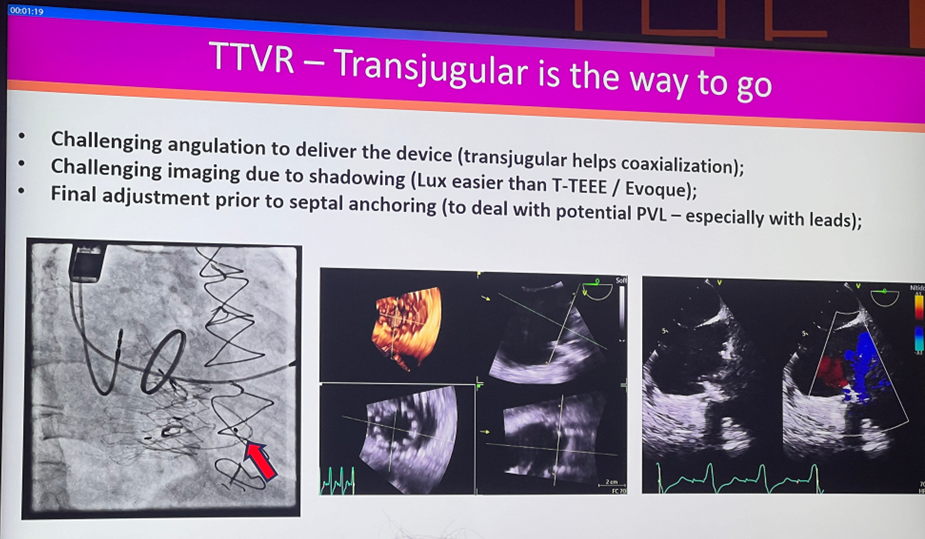 巴西圣保羅(Rede D'Or São Luiz, São Paulo, Brazil)的 Vinicius Esteves 教授結(jié)合了二例 LuX-Valve Plus 的植入案例探討了經(jīng)頸靜脈入路在TTVR中的優(yōu)勢(shì)。通過(guò)對(duì)比傳統(tǒng)經(jīng)股靜脈入路和經(jīng)頸靜脈入路,經(jīng)頸靜脈入路因?yàn)楦痰穆窂娇梢詼p少手術(shù)風(fēng)險(xiǎn)、縮短手術(shù)時(shí)間,并顯著降低術(shù)后并發(fā)癥;且更易對(duì)瓣膜的軸向性進(jìn)行調(diào)整,以降低瓣周漏的發(fā)生。同時(shí),由于經(jīng)頸靜脈入路并未產(chǎn)生更多的血管并發(fā)癥,越來(lái)越多的三尖瓣置換器械也在進(jìn)行經(jīng)頸靜脈入路的探索,展現(xiàn)了三尖瓣置換未來(lái)趨勢(shì)的一種可能性。LuX-Valve Plus作為頸靜脈入路TTVR器械的早期探索者,積累了非常豐富的臨床經(jīng)驗(yàn)。